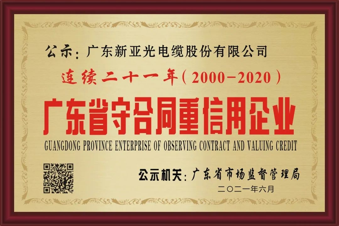 熱烈祝賀新亞電纜連續(xù)二十一年獲評“廣東省守合同重信用企業(yè)”榮譽