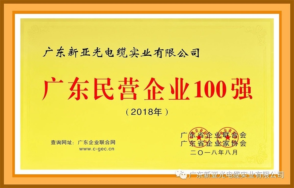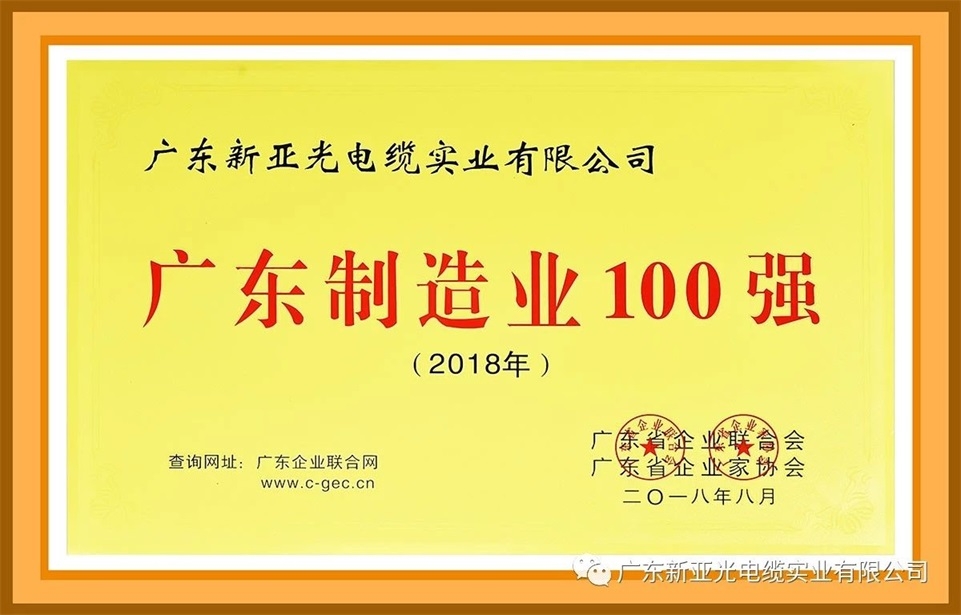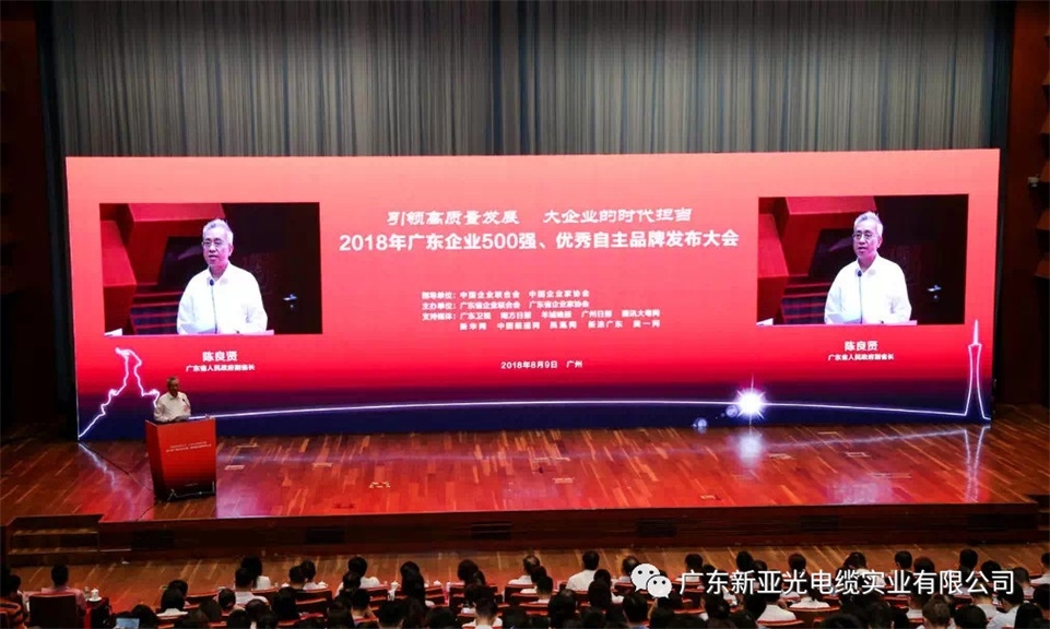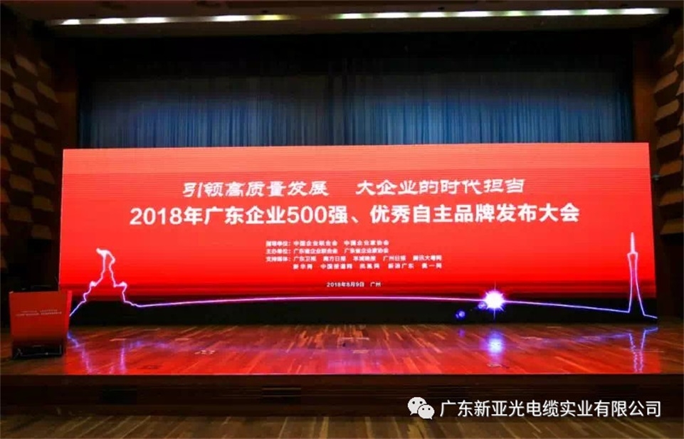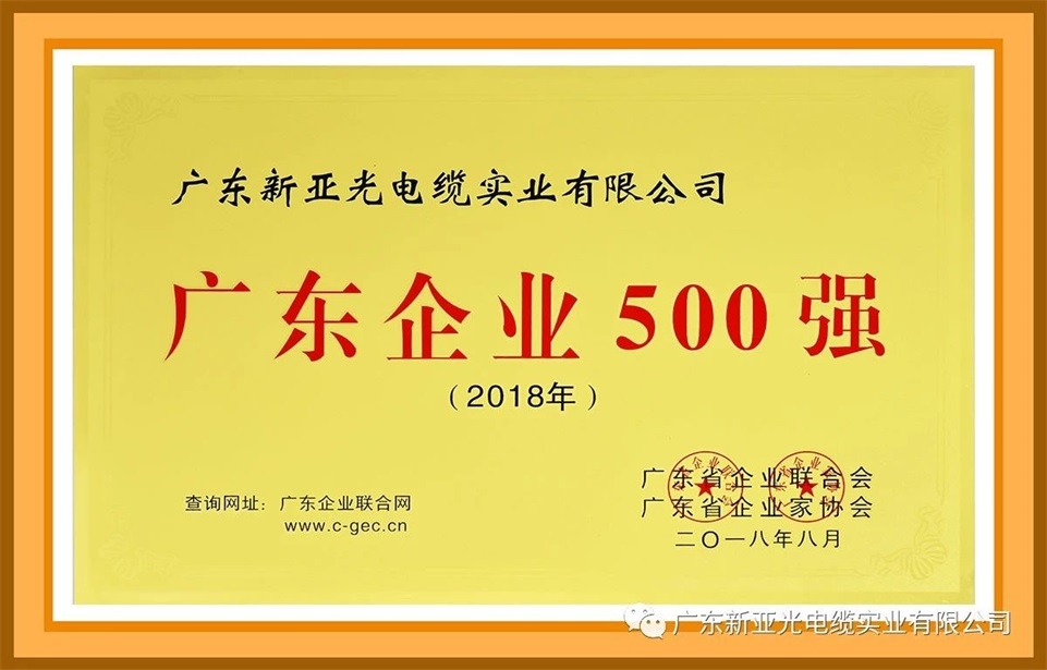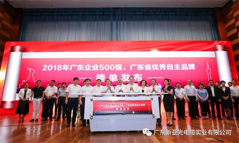 省企業聯合會、省企業家協會在會上公布了備受矚目的2018年“廣東省企業500強”、“廣東省優秀自主品牌”等榜單,廣東新亞光電纜實業有限公司一如既往地堅持“產品與服務并重,質量第一,客戶至上”的企業宗旨,以雄厚的資金、科學的管理、強大的研發和持續改進的生產力,榮膺廣東企業500強、廣東民營企業100強、廣東制造業100強的稱號。