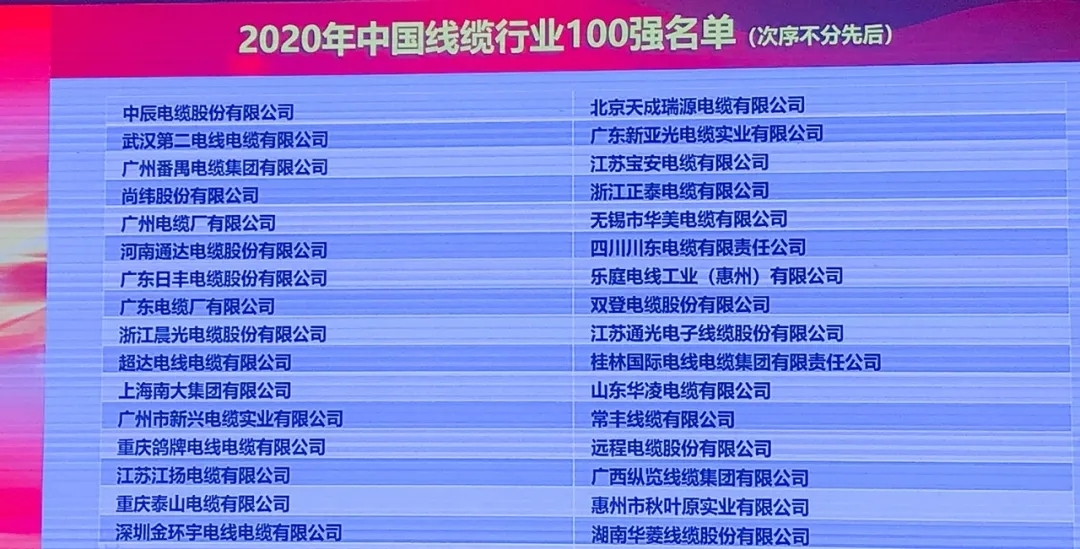 大會(huì)還發(fā)布了2020年中國(guó)線纜行業(yè)最具競(jìng)爭(zhēng)力“百?gòu)?qiáng)企業(yè)”名錄,廣東新亞光電纜實(shí)業(yè)有限公司光榮入選《2020年中國(guó)線纜行業(yè)100強(qiáng)》榜單。